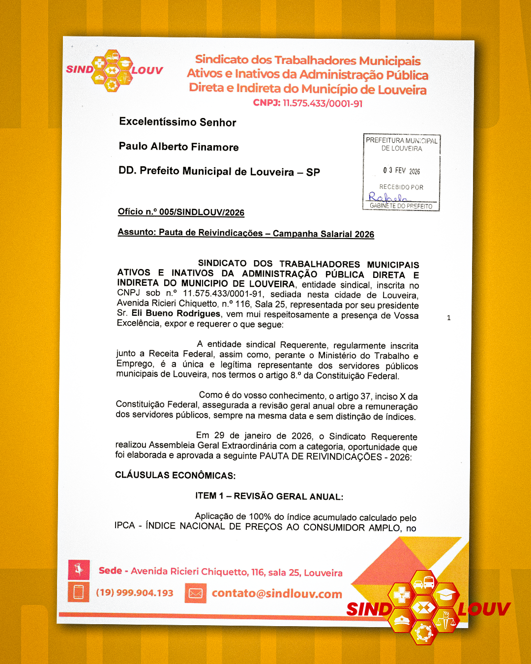 No dia 3 de fevereiro, o SINDLOUV protocolou oficialmente a Pauta definitiva ao prefeito Paulo Alberto Finamore, a fim de informar à Administração Municipal nossas demandas. Agora, aguardamos um retorno da Prefeitura para iniciarmos as negociações. A Campanha Salarial 2026 segue forte como o instrumento de luta, mobilização e afirmação de que valorização profissional não é uma opção, mas sim um direito garantido por lei.