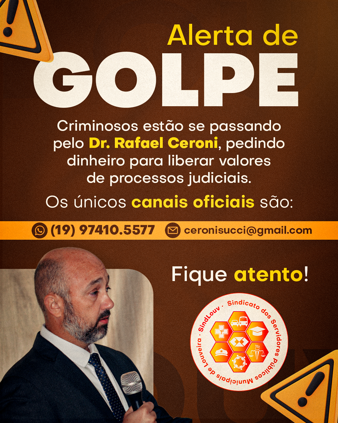 O Sindicato alerta todos os Servidores de Louveira para estarem atentos a possíveis fraudes e golpes por telefone, e-mail, WhatsApp, etc. Desta vez, golpistas estão se passando pelo Dr. Rafael Ceroni Succi, responsável pelo Departamento Jurídico do Sindlouv. Os criminosos ligam, enviam mensagens e pedem dados sigilosos, incluindo pedido de transferências bancárias. Tome cuidado e não acredite em golpistas!