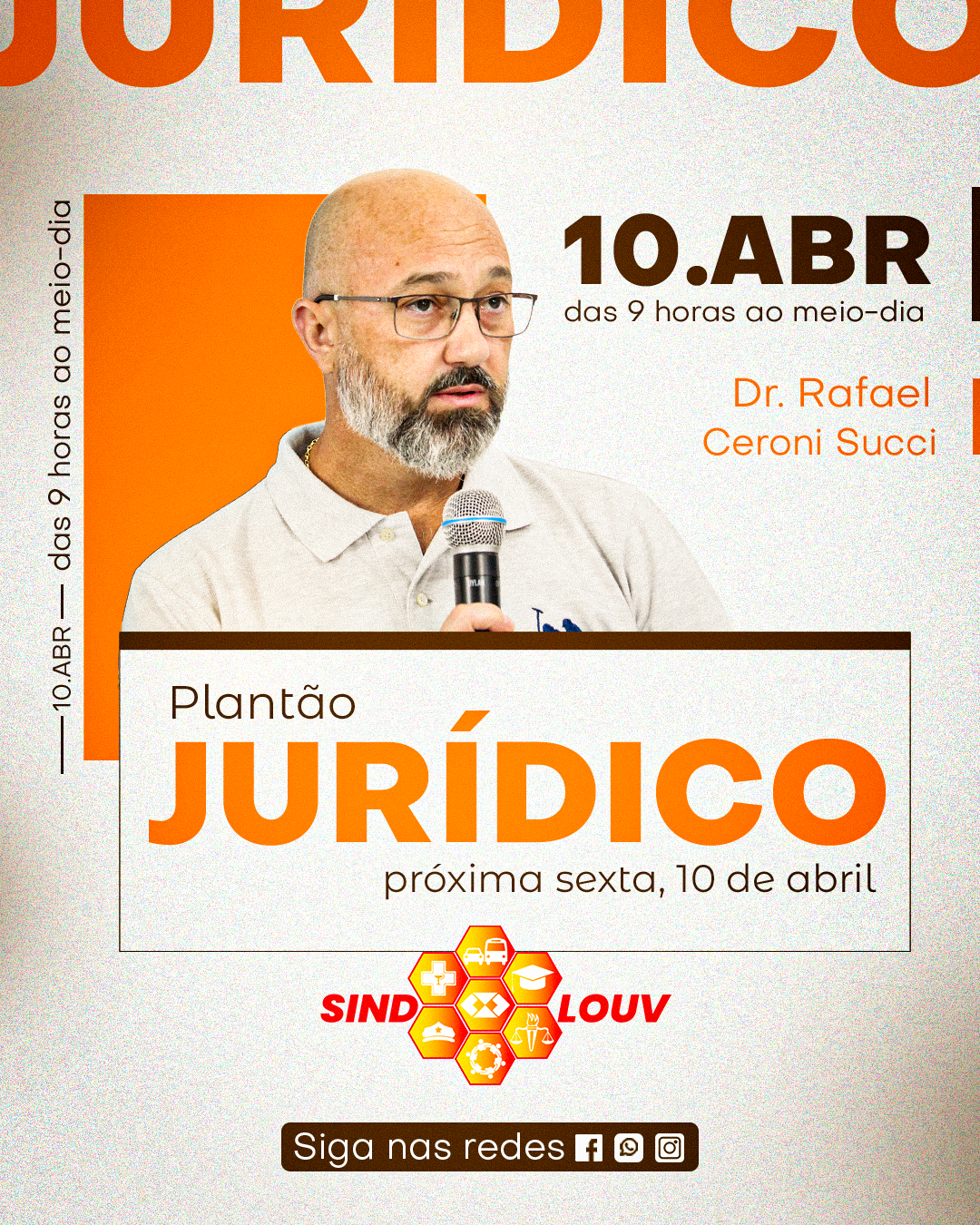 O SINDLOUV reforça a importância de seus filiados terem acesso a orientações jurídicas de qualidade e informa aos Servidores sobre o primeiro plantão Jurídico de dezembro com o advogado Dr. Rafael Ceroni Succi. O atendimento será na próxima sexta, 10 de abril, das 9 horas ao meio-dia, na avenida Ricieri Chiquetto, 116, sala 25. Para fazer o seu agendamento, entre em contato pelo WhatsApp do Sindicato (19) 99990.4193.