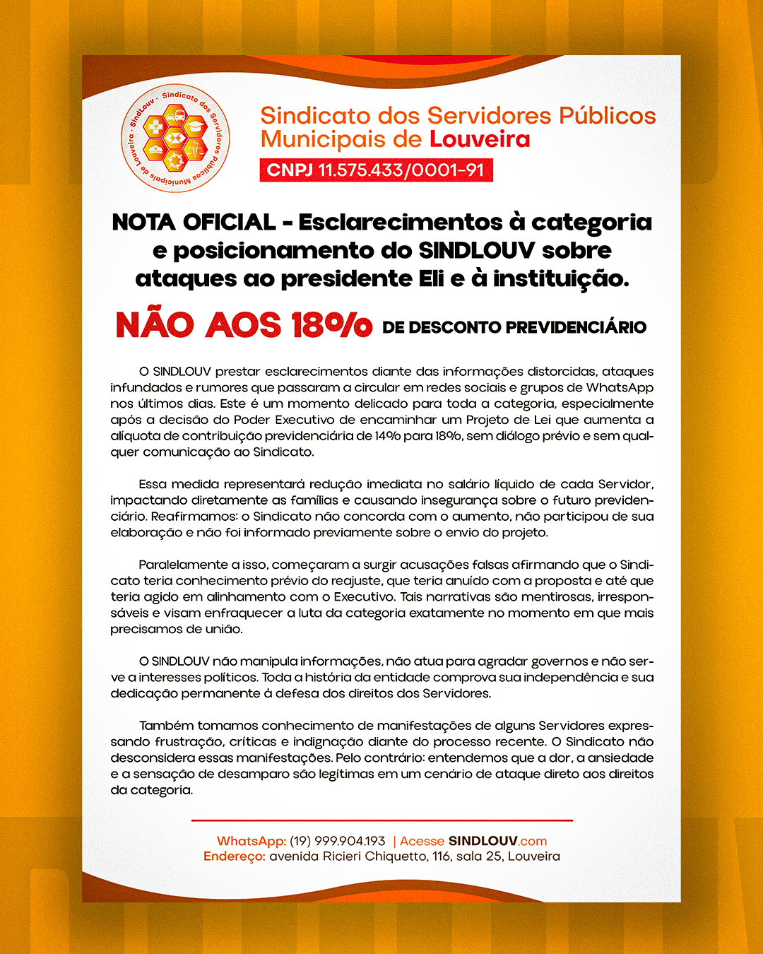 NOTA OFICIAL – Esclarecimentos à categoria e posicionamento do SINDLOUV sobre ataques ao presidente Eli e à instituição. NÃO AOS 18% DE DESCONTO PREVIDENCIÁRIO