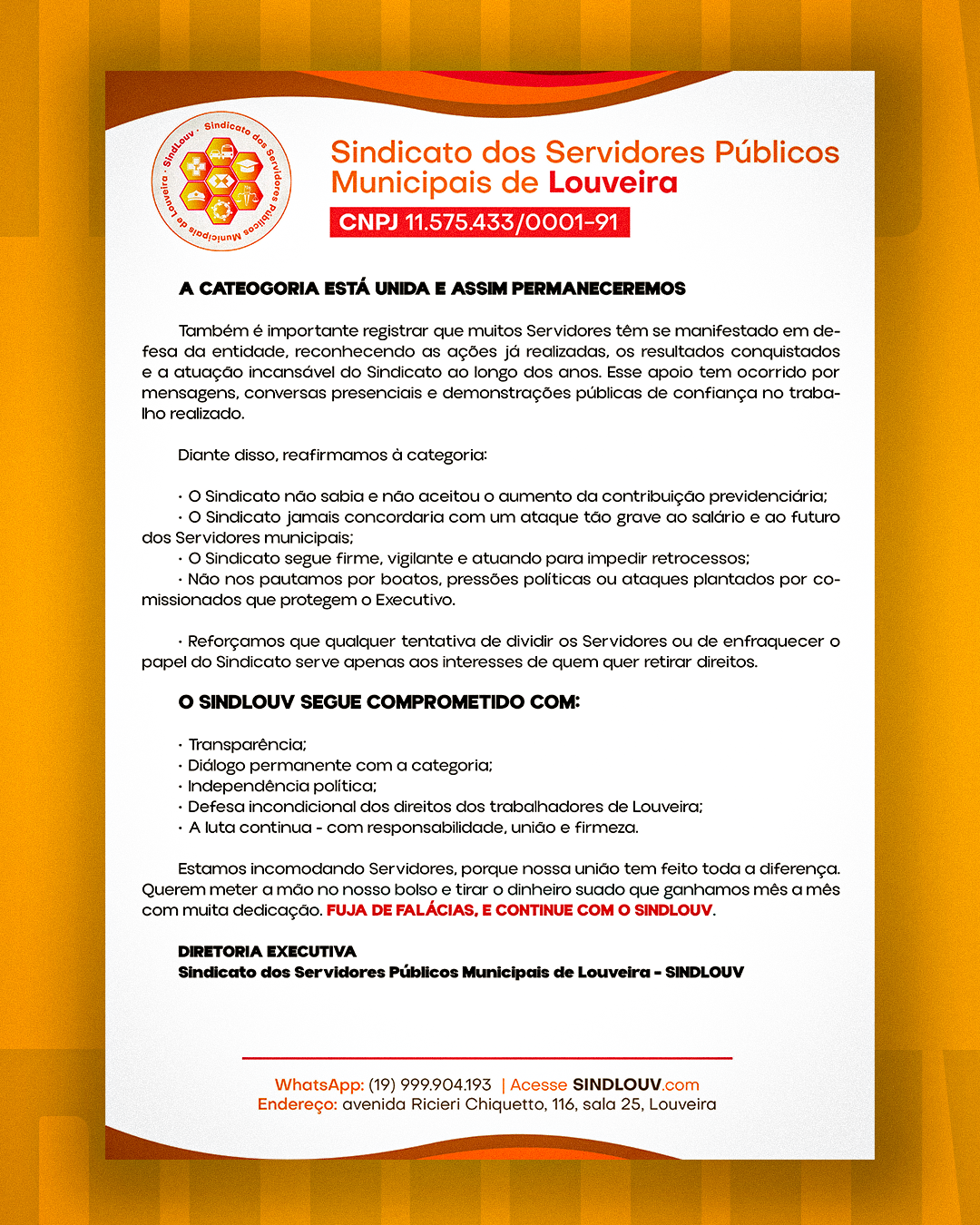 O SINDLOUV vem prestar esclarecimentos diante das informações distorcidas, ataques infundados e rumores que passaram a circular em redes sociais e grupos de WhatsApp nos últimos dias. Este é um momento delicado para toda a categoria, especialmente após a decisão do Poder Executivo de encaminhar um Projeto de Lei que aumenta a alíquota de contribuição previdenciária de 14% para 18%, sem diálogo prévio e sem qualquer comunicação oficial ao Sindicato.