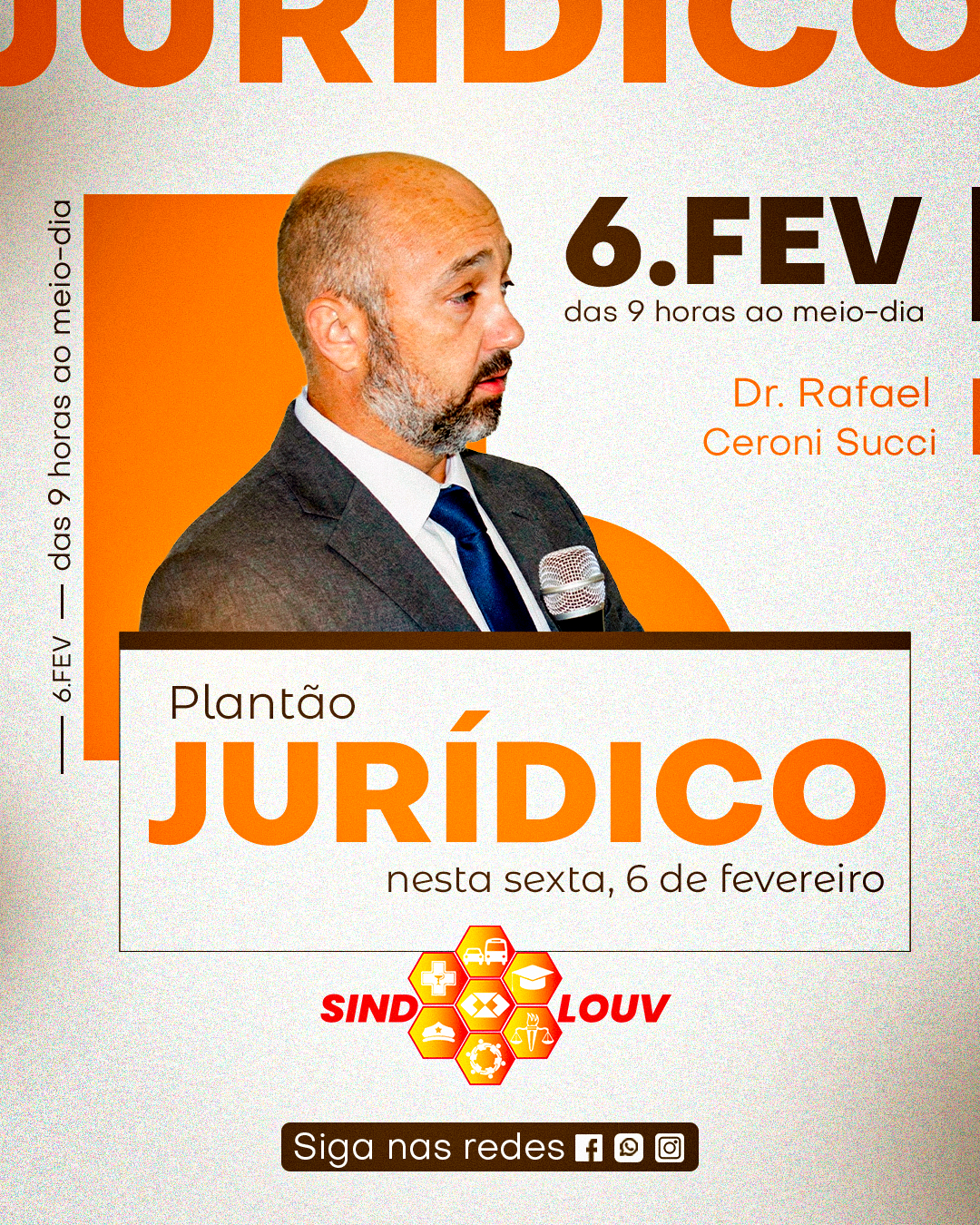 O SINDLOUV reforça a importância de seus filiados terem acesso a orientações jurídicas de qualidade e informa aos Servidores sobre o primeiro plantão Jurídico de dezembro com o advogado Dr. Rafael Ceroni Succi. O atendimento será na sexta, 6 de fevereiro, das 9 horas ao meio-dia, na avenida Ricieri Chiquetto, 116, sala 25. Para fazer o seu agendamento, entre em contato pelo WhatsApp do Sindicato (19) 99990.4193.