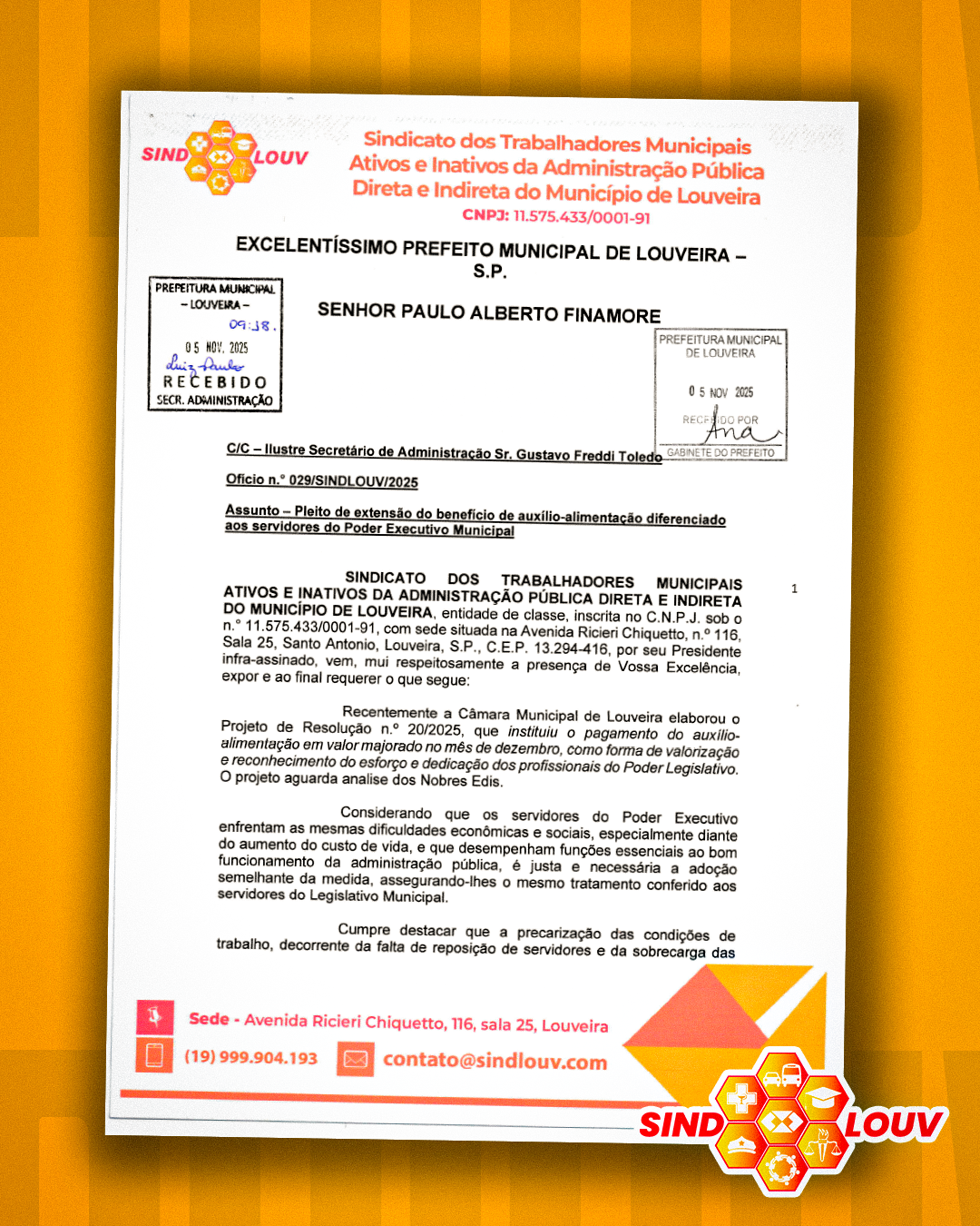 Em ofício encaminhado ao prfeito Paulo Alberto Finamore, o Sindlouv formalizou a solicitação de que seja estendido aos Servidores da Prefeitura o benefício de auxílio-alimentação em valor majorado no mês de dezembro. A reivindicação baseia-se no Projeto de Resolução nº 20/2025, já elaborado pela Câmara Municipal para os seus próprios Servidores, onde prevê justamente esse incentivo financeiro extra como reconhecimento pelo trabalho desempenhado.
