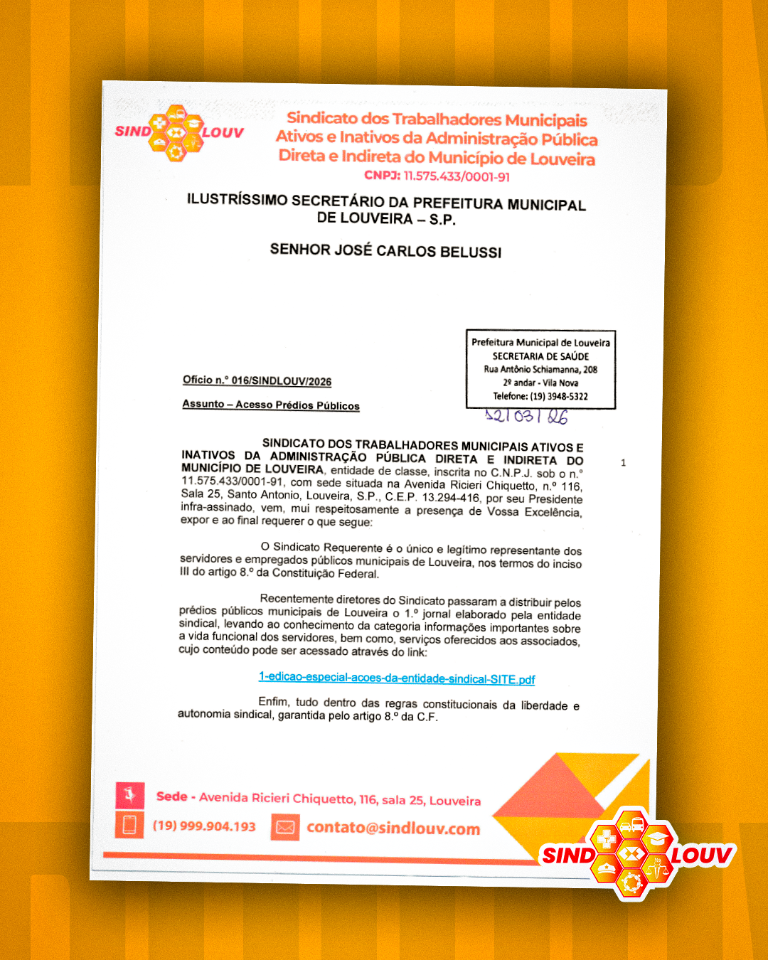 A direção do Sindlouv protocolou o Ofício nº 16/2026 na Secretaria Municipal de Saúde. Neste documento, relatamos episódios em que funcionários comissionados de unidades básicas passaram a descartar no lixo os exemplares do jornal sindical destinados aos Servidores. A atitude, segundo a entidade, causou estranheza e motivou a adoção de medidas formais para garantir o direito de comunicação com a categoria. O sindicato ressalta que a entrega do material sempre ocorreu de maneira ordenada, sem prejuízos à rotina dos serviços ou à população atendida.