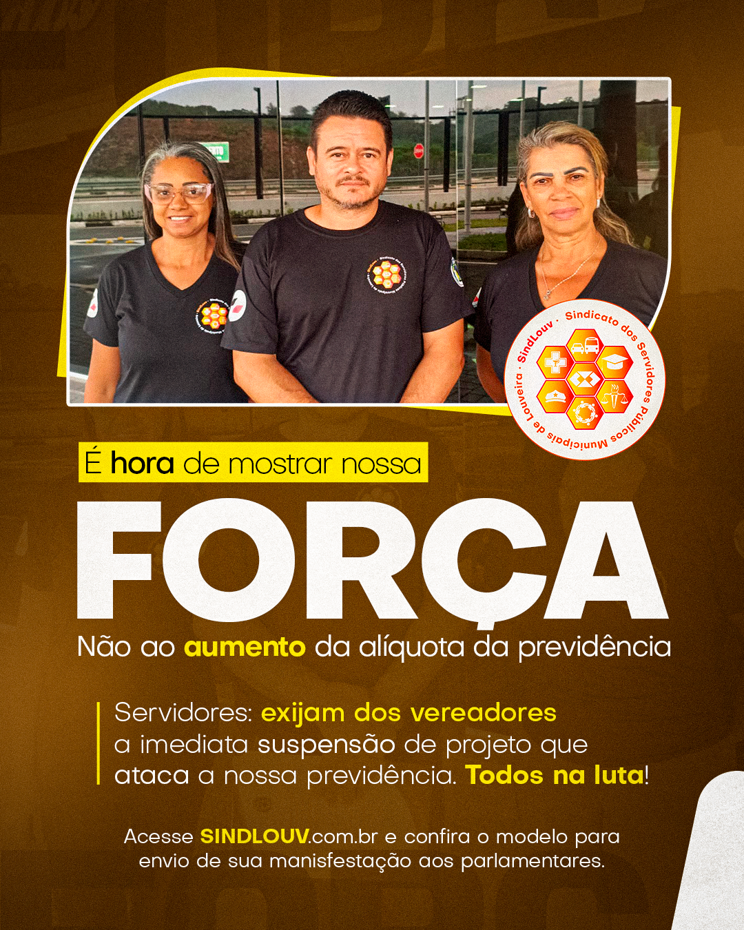 Venho, por meio deste, manifestar minha mais veemente repulsa ao Projeto de Lei que majora a alíquota previdenciária dos servidores municipais de Louveira, tramitando de forma absolutamente antidemocrática, sem transparência e sem a participação do Sindicato da categoria.